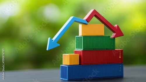 A colorful graph made of stacked containers with arrows indicating growth and decline, set against a blurred green background.