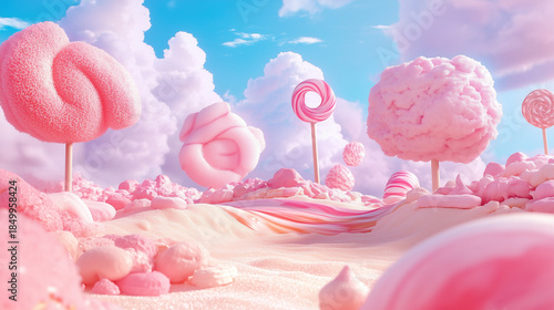 A colorful pastel landscape filled with delicious, tempting sweets and candies. The dreamlike scene features pink and blue cotton candy marshmallows in a vibrant 3D design.