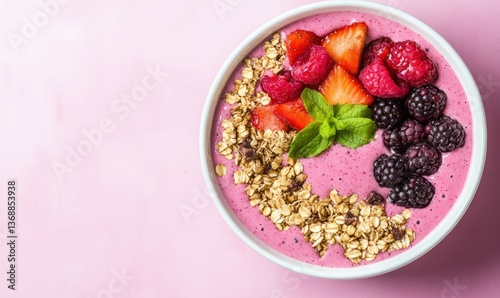 A colorful smoothie bowl with fresh raspberries, strawberries, blackberries, and granola sits on a pink background.