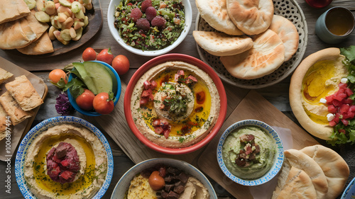 A colorful spread of mezze dishes, featuring vibrant hummus, tabbouleh, baba ghanoush, and pita bread arranged on a rustic wooden table.