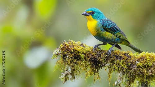 A colorful turquoise and yellow bird perched on a mossy branch in a natural setting outdoors