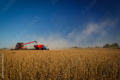 A combine harvester at work unloading onto a grain trailer while harvesting a soybean field.