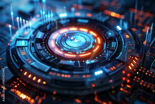 A complex circuit board with a central glowing component surrounded by intricate patterns and bright lights