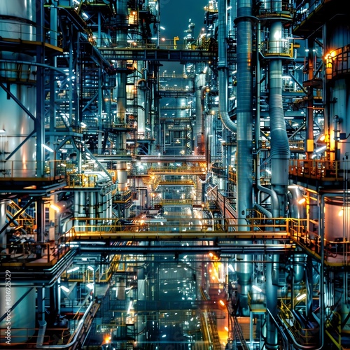 A complex network of pipes, tanks and machinery in a chemical plant, illuminated by bright blue and yellow lights reflecting off the metal surfaces and creating a futuristic atmosphere.