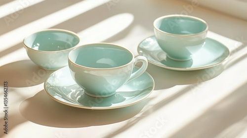 A composition of ceramic cups and plates with soft shadows on a neutral surface.