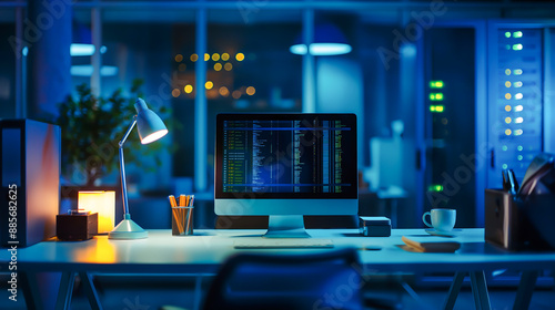 A computer desk with office supplies and a monitor, A server room in the background