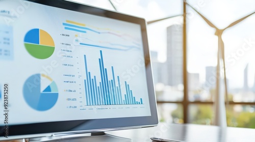 A computer monitor displays a graph with a blue line and a green line