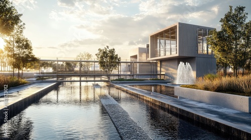A conceptual image of an urban water treatment facility purifying water, highlighting clean water production and urban infrastructure for sustainability