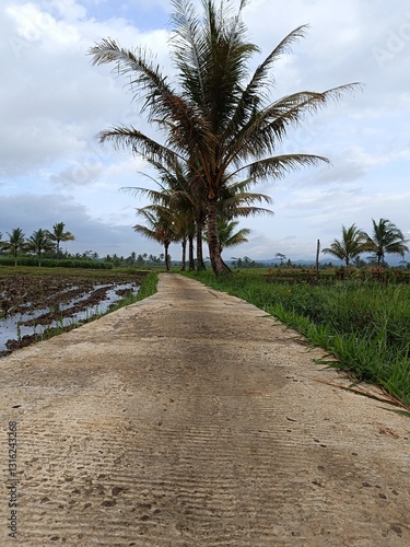 A concrete path stretches into the distance, flanked by lush green rice fields and palm trees under a cloudy sky, capturing a serene rural landscape