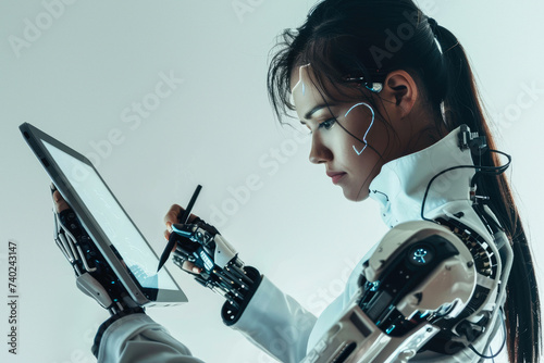 A confident woman in modern attire gracefully gazes at her tablet, showcasing the perfect blend of technology and humanity