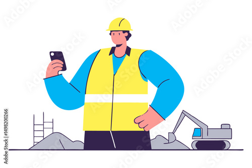 A construction worker in a hard hat and high-visibility vest checks his phone on a building site with an excavator and piles of dirt.