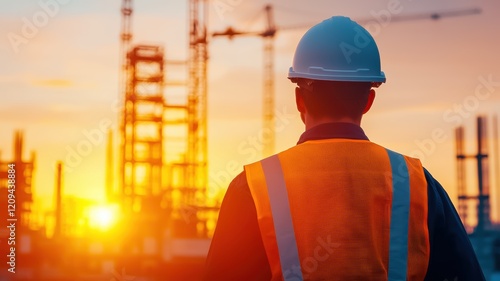 A construction worker in a hard hat and safety vest observes a skyline of cranes at sunset, symbolizing progress and industry.