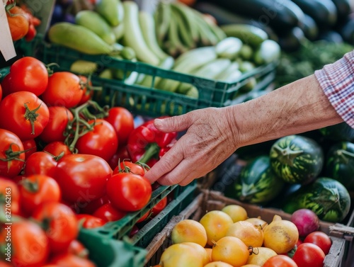 A consumer's hand as he reaches for fresh produce at a farmers market.