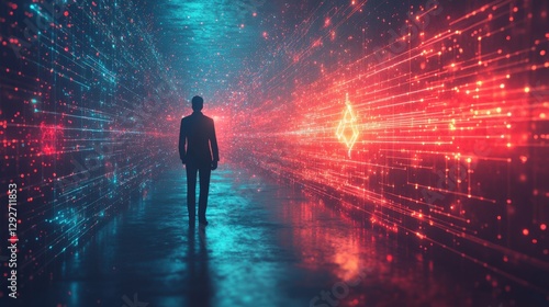 A contemplative young adult male in a formal suit stands alone in a surreal, neon-lit corridor filled with vibrant digital patterns and glowing light effects, evoking a sense of futurism.