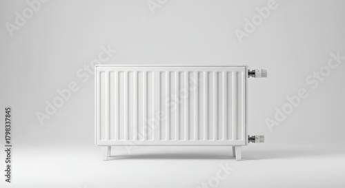 A contemporary, clean, and isolated white heating radiator appliance centered against a pure, seamless white studio backdrop, ready for winter warmth ,interior ,efficiency ,new
