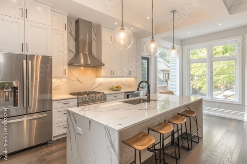 A contemporary kitchen with marble countertops