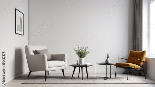 A contemporary living room arrangement featuring a minimalist armchair against a blank white wall, creating an uncluttered and tranquil atmosphere, Generative AI