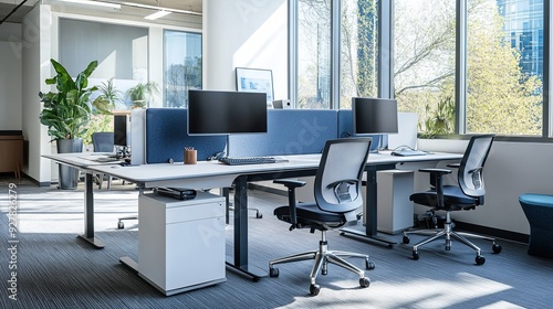 A contemporary office with a clean, open layout, where employees work at desks with laptops and other office essentials