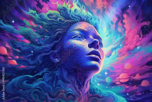 A cosmic portrait of a woman with vibrant colors and celestial elements.