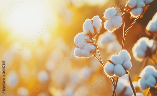 A cotton field bathed in warm golden sunlight, with fluffy white cotton bolls in focus.