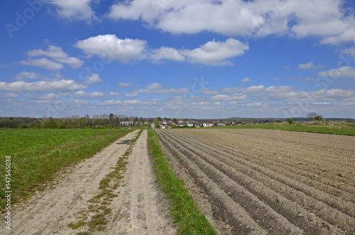 A country road among the fields with a view to a disant village, blue sky with scattered clouds in the background