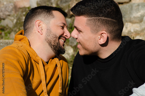 A couple of gay men in love come closer to kiss while smiling at each other. Homosexuality and LGBTQ+ concept.