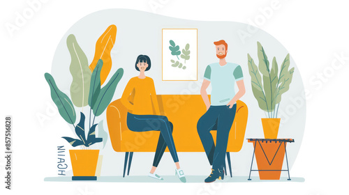 A couple relaxes on a yellow sofa in a modern apartment. The man leans back while the woman sits upright. Plants and a framed picture decorate the room