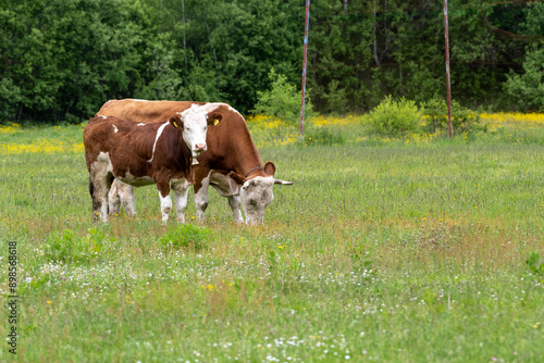 A cow and calf lies on the green grass. Simmental cow and calf in the highlands. Simmental domestic cow (Bos taurus).