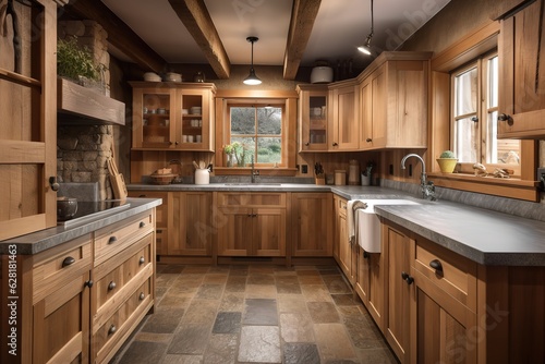 A cozy and rustic cabin-style kitchen with wooden. Generated AI