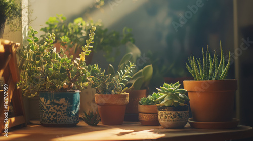 A cozy and whimsical indoor plant setup on a wooden table, featuring an eclectic mix of vibrant potted succulents and tropical greens, bathed in golden hour light