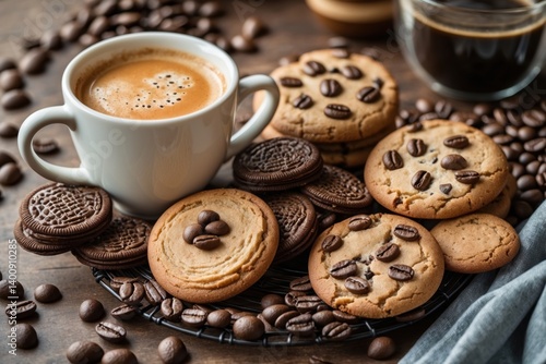 A cozy arrangement of assorted cookies on a plate next to a steaming cup of coffee, with coffee beans scattered around, creating a warm and inviting atmosphere.