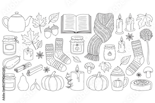 A cozy autumn scene isolated on white background, featuring warm beverages, books, and seasonal decorations in a charming and inviting composition vector illustration