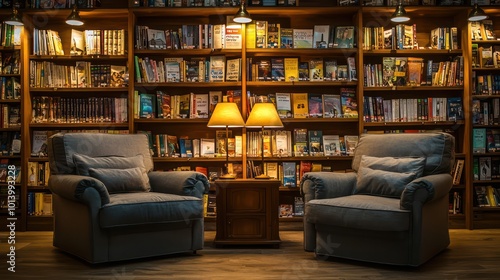 A cozy bookstore with wall-mounted reading lamps at each armchair, providing perfect lighting for customers to browse and read comfortably