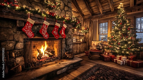 A cozy Christmas fireplace with stockings hung, a decorated tree nearby, and a warm fire crackling in the hearth