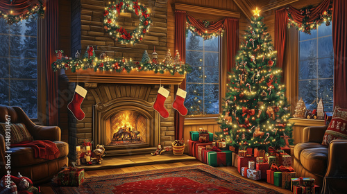 A cozy Christmas living room with a fireplace, decorated tree, and stockings, presents, vector style