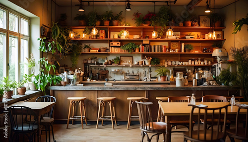 A cozy coffee shop interior featuring warm lighting, wooden furniture, and inviting decor, creating a perfect atmosphere for relaxation and socializing.