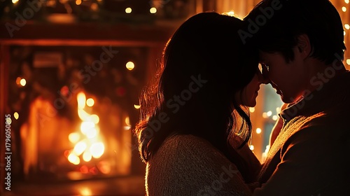 A cozy couple stands close by a glowing fireplace, wrapped in warm sweaters, gently touching foreheads, smiling with eyes closed, sharing an intimate and peaceful winter evening moment. Generative AI
