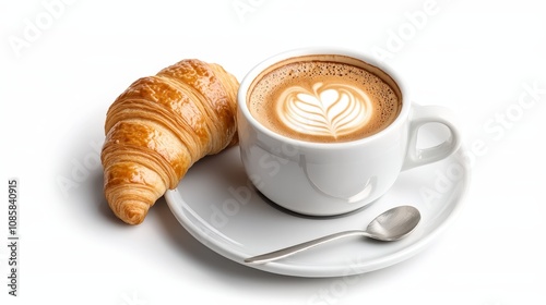 A cozy cup of cappuccino with latte art, paired with a flaky croissant on a white plate, perfect for a delightful breakfast.