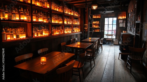 A cozy, dimly lit whiskey bar, with vintage wooden furniture and shelves filled with glowing amber bottles, the scene exuding warmth and old-world charm