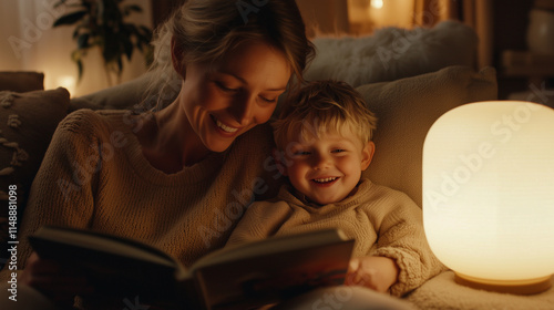 A cozy indoor portrait of a mother reading a storybook to her smiling child, both cuddled up on a soft couch with a glowing lamp illuminating the serene scene.