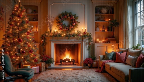 A cozy living room decorated for Christmas: a Christmas tree with lights, a fireplace with flames and garlands, creates a warm atmosphere of celebration and comfort.