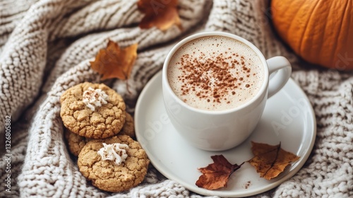 A cozy morning scene with a pumpkin spice latte and a plate of warm cookies