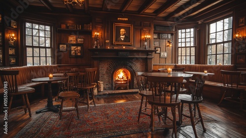A cozy pub interior with a fireplace, wooden furniture, and a warm, inviting atmosphere.