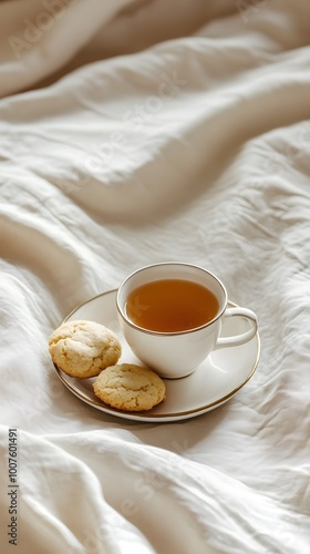 A cozy scene featuring a cup of tea and a plate of homemade cookies, evoking warmth and comfort, on a light solid color background
