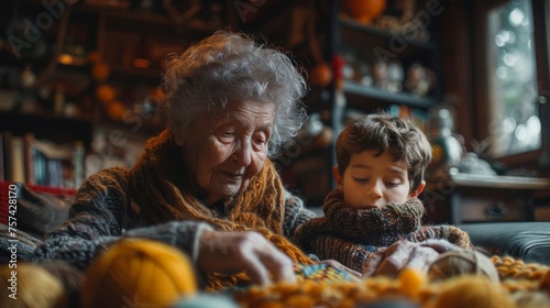 A cozy scene in the living room where a grandmother is teaching her grandson how to knit, with colorful balls of yarn around them and a half-finished scarf on her lap