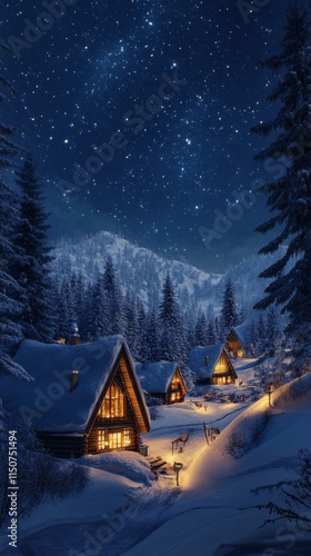 A cozy winter scene of snow-covered cottages lit by warm golden lights, with soft snowflakes falling. A celebration of seasonal joy and connection. HD phone wallpaper.