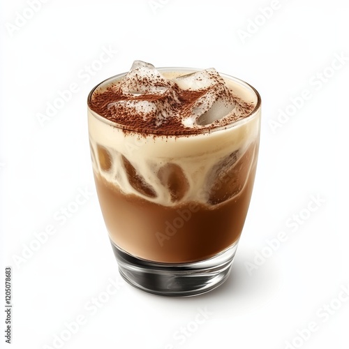 A creamy Irish Cream cocktail with a dusting of cocoa powder, served in a small glass over ice, the cream swirling gently