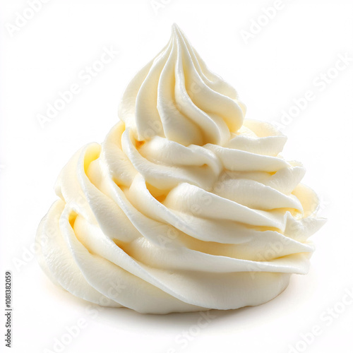 A creamy swirl of soft-serve ice cream, elegantly shaped with a smooth texture and a glossy finish, set against a plain white background.