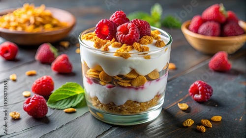 A creamy yogurt parfait with crunchy cereal and fresh raspberries, a delightful combination of textures and flavors