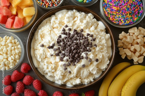 A creative flat lay of various ice cream toppings, including sprinkles, chocolate chips, and fruit, around a bowl of vanilla ice cream.
